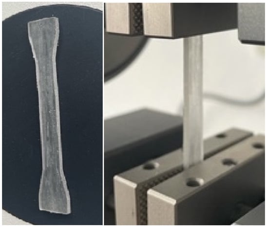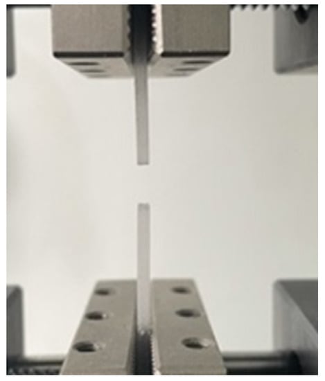 - To determine the tensile strength (Figure 3), a test piece was subjected to an increasing axial force, typically until it broke, while the accompanying changes in the test piece’s length were recorded. Based on the ASTM-D638 reference standard [16], measurements were performed using a load force of 5 N and a stress of 1000 N/mm2. The test pieces utilized for the tensile test were flat rectangular shapes with dimensions of 2 mm thick, 6 mm wide, and 40 mm long. They provided the testing equipment with a calibrated part and two gripping ends (2 mm × 10 mm × 10 mm).