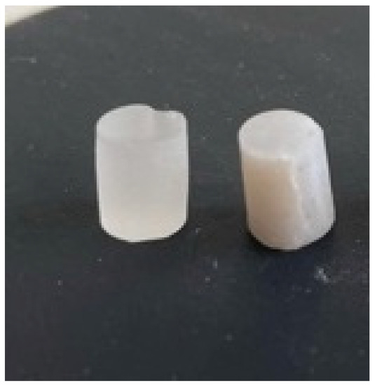 The aspect of the samples after the compression test (left—PMMA control, right—3D printed).