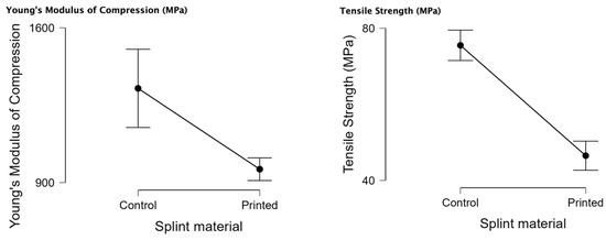In Table 1, the results of the Young’s modulus of compression and tensile strength are represented. Only valid registrations of the tested samples have been used in this analysis. The values for the Young’s modulus of compression for both printed and control samples have a normal distribution (p < 0.05). The tensile strength for printed samples also has a normal distribution (p < 0.05), and the control has a non-normal distribution.
