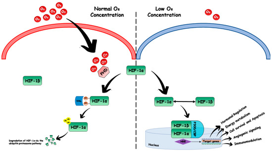 When the oxygen concentration drops below dangerous levels, PHDs are inactivated and HIF-1α and HIF-1β can translocate to the nucleus, dimerize, and bind to p300/CBP to form a transcriptional activation complex that binds to HRE and activates the transcription of target genes [18] (Figure 1).