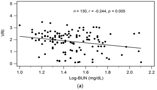 By univariate linear regression analysis, we detected a negative correlation between logarithmically transformed BUN (log-BUN, r = −0.244, p = 0.005), and a positive correlation between serum adiponectin (r = 0.512, p < 0.001) and eGFR (r = 0.230, p = 0.008), respectively, and VRI values in patients with CKD (Table 2). In addition, adjustments for variables significantly associated with VRI values in univariate linear regression analysis revealed a significant and independent negative, and a significant independent positive association between log-BUN (standardized β = −0.176, adjusted R2 change = 0.025; p = 0.021), and adiponectin (standardized β = 0.487, adjusted R2 change = 0.256; p < 0.001), respectively, and VRI values in patients with CKD by multivariate stepwise linear regression analysis (Table 2).