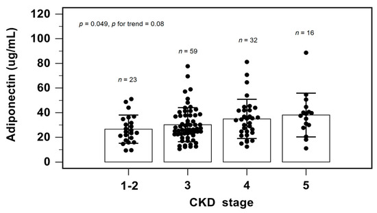 Figure 2 shows the serum adiponectin level among different CKD stages by one-way analysis of variance and the Cochran–Armitage test for trend. As the CKD stage progressed, the serum adiponectin levels elevated (p = 0.049). The Cochran–Armitage test for trend also confirmed this finding (p = 0.008).