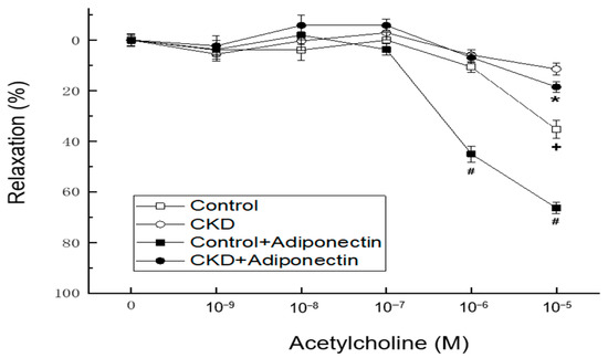 Adiponectin treatment ameliorates the CKD-induced hyporeactivity to vasorelaxation in the mouse aorta. * p < 0.05 for the CKD + adiponectin group compared with the CKD group. # p < 0.05 for the adiponectin group compared with control group. + p < 0.05 for the CKD group compared with the control group.