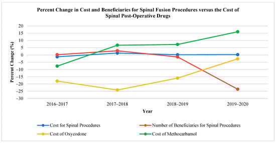 In this study, we assessed the temporal trends in commonly used drugs for both spinal fusion and brain tumor resection surgeries. By focusing on the most prescribed medications for spinal fusion surgery and brain tumor resection, we aimed to capture trends and characteristics relevant to a significant portion of patients undergoing these procedures. Although it is important to acknowledge that other medications could also be used in these procedures, introducing a broader range of medications could potentially introduce further complexities and reduce the specificity of our findings. Our analysis demonstrated that there was a statistically significant negative correlation between the total number of spinal procedure beneficiaries and the annual percent change in oxycodone and methocarbamol costs. Additionally, we found that there was a statistically significant correlation between the total number of brain tumor resection procedure beneficiaries and services when each was compared to the cost of levetiracetam. When linear regression analysis was applied, oxycodone was the only drug that was significantly associated with the number of beneficiaries and services.