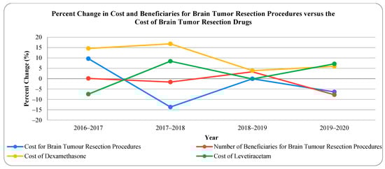 Percent difference in the total number of brain tumor resection beneficiaries, the average cost of brain tumor resection, and the cost of brain tumor resection drugs.