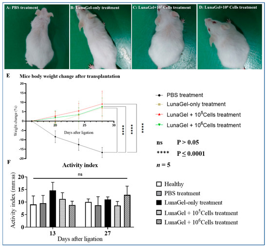 The appearance and weight results of the mice two weeks after treatment. (A–D) Apperance of mice after two weeks of receiving PBS treatment, LunaGel-only treatment, “LunaGel + 105 Cells” treatment, and “LunaGel + 106 Cells” treatment, respectively. (E) % weight change of mice after receiving the treatments. (F) The mice movement activity index before (day 13) and after (day 27) receiving the treatments.
