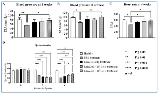 At 4 weeks, the EF of the MI mice treated with PBS decreased to 0.22 ± 0.03, which is consistent with the blood pressure and heart rate results described above (Figure 2D). The MI mice that had LunaGel + cells treatment had improved EF in comparison to the MI mice receiving PBS; in particular, the EF averaged 0.32 ± 0.03 for the mice receiving LunaGel + 105 cells and 0.38 ± 0.01 for the mice receiving LunaGel + 106 cells. It is noteworthy that the MI mice receiving LunaGel-only treatment also had some improvement in their heart function compared to the MI mice receiving PBS treatment.