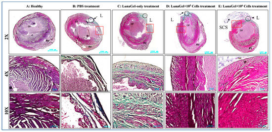 Trichrome staining of the mice’s heart tissue revealed that the MI mice’s heart tissue had a higher percentage of fibrosis in the groups receiving PBS treatment or Lunagel-only treatment compared to the healthy mice (Figure 3).