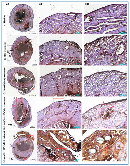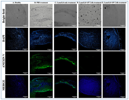 Figure 4 shows the results of cell apoptosis using Annexin V staining. In contrast with the normal muscle cells, which were negative for Annexin V, the MI mouse model promoted muscle cell death as seen in the groups treated with PBS (Figure 4A,B). Apoptosis significantly decreased in the groups grafted with LunaGel with or without cells. A thinner layer of muscle tissue positive for Annexin V was found in the LunaGel-only treatment group (Figure 4C), and the groups receiving LunaGel + cells treatment showed minimal positive staining (Figure 4D,E).