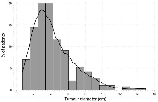 Tumor diameter distribution in patients (n = 285) diagnosed with kidney tumors subjected to nephrectomy or organ-sparing surgery.