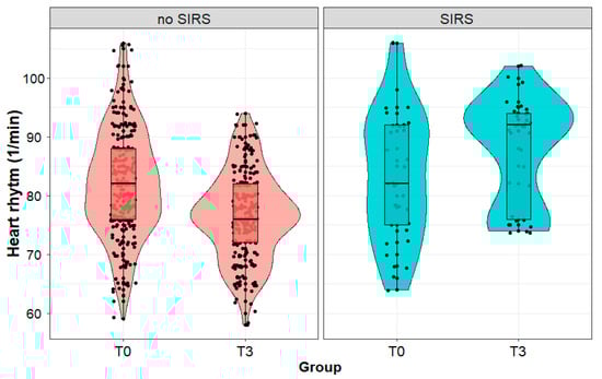 We observed a significant increase in the pulse value in patients with SIRS (84 (11) vs. 88 (9) 1/min; p < 0.01) and a significant decrease (82 (9) vs. 76 (7) 1/min; p < 0.001) in the pulse value in patients without SIRS during the postoperative follow-up (Figure 2). Immediately after the procedure (T0), we found no significant difference (p = 0.682) between the patients with and without SIRS developed on the third day. Patients diagnosed with SIRS on the third day after the surgery had statistically significantly higher HR (p < 0.001) that day than patients without SIRS.