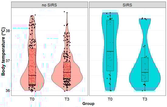 Body temperature (°C) in patients with and without systemic inflammatory reaction syndrome (SIRS) on the third day after surgery, measured immediately after (T0) and on the third day (T3) after the surgery performed due to a kidney tumor.