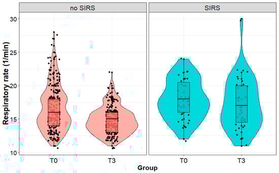 The respiratory rate of patients who developed SIRS on the third day after surgery was statistically significantly higher on the third day after surgery than in patients without SIRS (17 (4) vs. 15 (2) 1/min; p < 0.001), although we observed no significant difference (p = 0.981) between the patient groups immediately after the surgery. We observed no change (p = 0.372) in the respiratory rate in patients diagnosed with SIRS on the third postoperative day. On the other hand, the respiratory rate significantly decreased (p < 0.001) in the group of patients without SIRS (Figure 4).