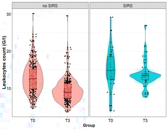 Leukocytes count (G/L) in patients with and without systemic inflammatory reaction syndrome (SIRS) on the third day after surgery, measured immediately after (T0) and on the third day (T3) after the surgical removal of the kidney tumor.