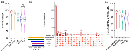 Similarity of coding sequences (CDSs) between human genome and animal models. (a) Distribution of the CDS identity percentages between the human genome and five different animal models. The line inside the violin plot represents the median values. (b) The total number of mapped CDSs in five different species against the human genome. The upset plot shows intersections across the five comparisons. Each bar represents the number of mapped CDSs, and the orange dot below the bar indicates their conservation status across each species. (c) Distribution of percentage identities of 10,316 conserved CDSs between the human genome and five animal models. The line inside the violin plot represents median values. Comparisons of the percent identities between the species are statistically significant unless noted by ns = statistically non-significant, as determined via a one-way ANOVA and Bonferroni’s multiple comparison test (p-values are provided in Supplementary Table S4).