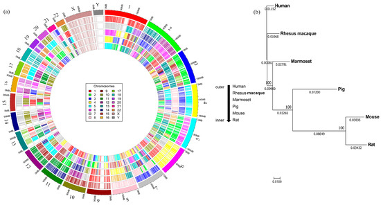Mapping of the synteny blocks of model organism chromosomes onto human chromosomes and phylogenetic analysis. (a) The Circos plot shows the positions of 10,316 conserved CDSs for five different animal models, using a unique color for each chromosome number. The outermost circle represents the color-coded human chromosomes, and each inner circle represents the mapping of the synteny blocks of chromosomes from each species onto the human chromosomes, showing how they are distributed across the human chromosomes. The number of chromosomes varies across each species; rhesus macaques have Chr1-20, X, Y; marmosets have Chr1-22, X, Y; pigs have Chr1-18, X, Y; mice have Chr1-21, X, Y; and rats have Chr1-20, X, Y. (b) A phylogenetic tree was constructed based on the 10,316 conserved CDSs, which showed that the evolutionary distance from the human genome was the shortest for the rhesus macaque, followed by the marmoset, pig, mouse, and rat. The values above and below the line indicate the bootstrap numbers and the evolutionary distances between the species.