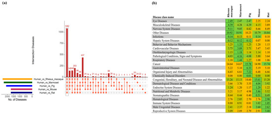 Comparison of the SNP-associated human diseases across the animal models. (a) An upset plot shows the intersections of the SNP-associated human diseases across the five species. Each bar represents the number of identified diseases, and the orange dot below the bar indicates their conservation across the comparisons. (b) The diseases were classified into 24 different categories, and the percentages of a specific disease class in each animal model were plotted. Higher to lower percentage numbers within species are colored from green to yellow. The highest value across species for each disease class is indicated by a box.