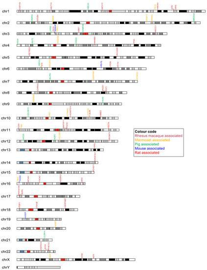 A comprehensive understanding of the genomic relatedness between humans and other mammals is necessary to evaluate the common pathways and functional similarities and the appropriateness of using different animal models to study human diseases. Although the mouse is the most commonly used animal model in the study of human diseases [1], its smaller size and lifespan and differences in the latency periods for diseases [2], drug metabolism [3], inflammatory response [4], and other processes [5,6,7,8] suggest the need to identify animal models with more disease-relevant similarities to humans for the study of human diseases. A comparison of genomic sequences among human, mouse, and pig genomes indicated that pig sequences were closer to the human sequences, with greater numbers of ultra-conserved regions compared to the mouse genome [9,10,11]. Nonhuman primates are evolutionarily more closely related to humans. After the ban on working with chimpanzees and other great apes, macaques have become the most closely related nonhuman primate model used to study human diseases [12]. Human disease genes and known drug domains have shown high degrees of similarity with the rhesus macaque genome [13]. The marmoset, on the other hand, makes for a useful animal model due to its short gestation and sexual maturation periods and its greater sequence similarity with humans compared to rodents [12]. It is also a useful model for studying diseases in neurobiology [14]. A comparative analysis of disease-associated genetic variations across commonly used animal models will deepen our understanding of the similarities, leading to the appropriate use of specific animal models for disease-specific research.