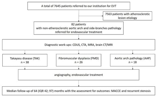A total of eighty-two (1.07%) consecutive patients with NA-AAPs out of 7645 patients referred to EVT for diseases of the aortic arch and its side-branches between 2002 and 2022 at a tertiary hospital (the John Paul II Hospital, Krakow, Poland) were retrospectively reviewed. The study’s flow chart is presented in Figure 1. Patients were divided into three categories: TAK disease, FMD, and other AAPs.