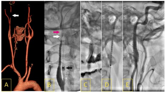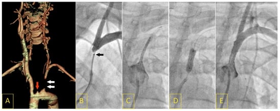 A 17-year-old female presented with “stuttering” symptoms of left-hemisphere ischemia (8 points on the National Institute of Health Stroke Scale upon admission). Computed tomography angiography showed a proximal left subclavian artery (LSA) occlusion (white arrows) with coexisting ostial left internal carotid artery occlusion (red arrow, (A)). The LSA occlusion segment was crossed with a V-18 Control Wire with a support of a NaviCross 4F catheter (tip of the support catheter marked with a black arrow (B)). Following predilatation, a drug-eluting balloon-mounted stent (Nefro 8 × 30) was implanted and postdilated (C,D). Angiography showed an optimal result of the procedure, with normal flow of the vertebral artery (E).