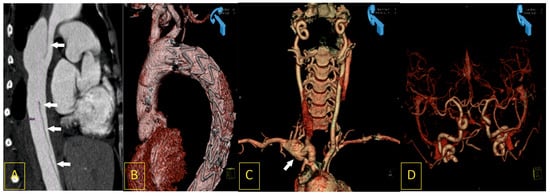 Ischemic stroke or TIA can occur in patients with aortic dissection type A and type B. Neurological symptoms appear in 17% to 40% of patients with aortic dissection, especially those with type A aortic dissection, including the most frequent right hemispheric stroke (69.2–71%) [,]. There are two possible pathogenic mechanisms: (1) the dissection may block blood flow through the supraaortic trunks or advance towards them, or, less frequently, (2) a mural thrombus may cause artery-to-artery embolism if it reaches the true lumen [,]. In patients without trauma, frequent etiologies of aortic arch and side-branch dissection are variants in the branching pattern of the aortic arch, predisposing the patient to intimal tearing. Aortic arch dissection is more frequent in patients presenting with a bovine arch, CoA, Kommorell aneurysm, a bicarotid trunk, or arteria lusoria with aneurysm formation [,]. CTA and MRA results showed that, in about 10–25% of the examined individuals, the aortic arch’s branches did not follow the “normal/usual” branching pattern, with variations in their numbers and origins [,].