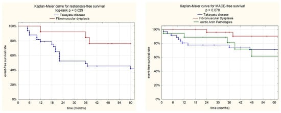 The present study focused on the outcomes and long-term prognosis of EVT in patients with TAK, FMD, and other AAPs. As the etiology of these morbidities varies, the outcomes depend on the natural course of specific diseases. We have demonstrated that the EVT procedures were feasible, associated with an acceptable 30-day severe complication rate of less than 2.5%. Most patients underwent EVT with provisional stenting, which is particularly recommended in TAK patients (in our study, 86.7%). In the study conducted by Joseph et al., cerebral hyperperfusion was a significant problem in TAK patients referred to EVT when all arch branches were severely obstructed []. This is in line with our present and previous observations [,]. One of two major severe periprocedural complications was hyperperfusion syndrome in patients with TAK presenting with an occluded left common carotid artery and right subclavian artery, who were referred for recanalization of the occluded left subclavian artery.