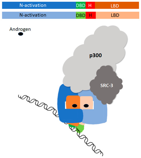 Since the AR is a member of the 48-member steroid receptor superfamily, it has the same basic structure as other family members, consisting of an N-terminal activation (NTD), DNA binding (DBD), and ligand binding domains (LBD), where a hinge region lies between the DBD and LBD [3,4,10]. The AR gene maps to the X chromosome and consists of eight exons [11,12]. The NTD is encoded by exon 1, exons 2 and 3 code for the DBD, and the C-terminal LBD is encoded by the terminal four exons. Exon 4 encodes the hinge region, which bridges the DBD and LBD and contains a nuclear localization signal [5]. Prior to ligand binding, the AR is inactive and complexed in the cytoplasm with heat shock proteins (HSPs) [13]. Ligand binding results in a conformation change, release from cytoplasmic HSPs, exposure of the nuclear localization signal, phosphorylation, and ultimately translocation into the nucleus. The dimerized AR DBD tethers the receptor to AR regulatory elements (AREs) on the target DNA to serve as a platform for the assembly of regulatory molecules to drive or repress transcription [6,14,15]. While the LBD and DBD X-ray structures have been solved separately, more recently Yu and collaborators defined the three-dimensional structure of an androgen-occupied AR bound to DNA using cryo-electron microscopy (cryo-EM) [14]. This study confirms that AR dimerizes in a head-to-head and tail-to-tail fashion, shows that the LBD, DBD, and NTDs all have a dimerization interface, and shows that the LBD and the NTD interact. Cryo-EM shows that the NTDs wrap around the LBD and have a major role in recruiting and interacting with SRC-3 and p300 co-regulators (Figure 1).