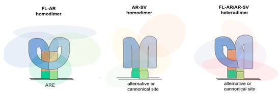 Schematic of homo and hetero dimers of FL-AR and AR-SV. The structures of the AR-SV homodimer and FL-AR and AR-SV heterodimers are unknown; therefore, they are solely the authors’ representation to denote differences. Since the DBD (green) is retained in FL-AR and AR-SV isoforms, the molecules are tethered to DNA sequences. The absence of the LBD (orange) would alter the intermolecular and intramolecular interactions of the NTD (blue); hence, the structure of the dimer would be different, as would the assembly of AR interactors (represented by the light-colored clouds). The unique complement of AR interactors would regulate AR DNA binding, transcriptional activity, and subsequent distinct transcriptional output.