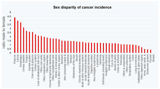 Male-to-female ratio of cancer incidence of the most common cancers (2023) [70].