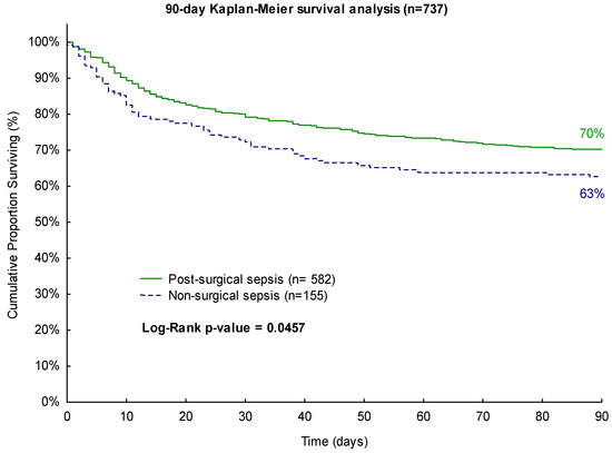 For the 90-day observation period, surgical sepsis patients exhibited a favorable survival rate of 70% compared to non-surgical patients with a survival rate of only 63% (p = 0.0457, Figure 2).