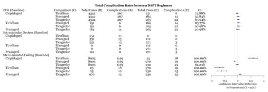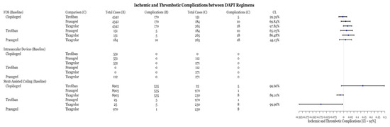 Percentages, odds ratios (OR), 95% confidence intervals (CI), and statistical significance were calculated using R software (R Foundation, Indianapolis, IN, USA). To compare the percentages and calculated p-Values, a t-test was used. The p-Value was considered statistically significant if less than 0.05. The rates of hemorrhagic, thromboembolic, and all complications were calculated per 100 cases within each device category and for each medication studied. For analysis, ischemic and in-stent stenosis were grouped into a single category. Studies that placed patients on more than one DAPT regimen were not included in the analysis to prevent confounding of the results. The use of various DAPT regimens were compared to one another for within each complication category using OR.
