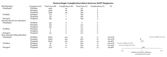 This meta-analysis demonstrates several important points. First, the comparison of individual DAPT regimens to each other for use with FDS demonstrated no difference in preventing ischemic or thrombotic complications (Figure 6). Thus, it may suggest that clopidogrel alternatives, including tirofiban, prasugrel, and ticagrelor, are as effective as clopidogrel at preventing thromboembolic complications. The SAC results demonstrate that ticagrelor was more effective at an 89% confidence level (Figure 6) at preventing ischemic and thrombotic complications than clopidogrel. Clopidogrel was more effective at reducing these complications at an 99.66% confidence level (Figure 6). However, the inclusion of zero in the confidence level indicates a low but statistically significant sample size, which necessitates further data collection. These results support the placement of patients that are hypo-responders to clopidogrel on ticagrelor or using intravenous tirofiban. Likewise, prasugrel was demonstrated to be more effective at preventing all complications in SAC compared to clopidogrel (Figure 3). Examination of the hemorrhagic complications demonstrates that prasugrel is more effective, and ticagrelor as effective, at preventing intracranial hemorrhagic complications with SAC than clopidogrel (Figure 4). Alternatively, clopidogrel was shown to be more effective at preventing intracranial hemorrhagic complications in comparison to tirofiban when used with SAC (Figure 4). While the risk and extent of intracranial bleeding in the management of aneurysms increases with DAPT, more data are required to compare the effectiveness of various DAPT regimens in preventing intracranial hemorrhagic complications in FDS and intrasaccular devices. Randomized clinical trials are required to compare the effectiveness of various DAPT regimens against each other.