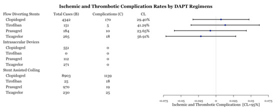 Within each medication category, the number of ischemic and thrombotic complications were compared between medication types. All intrasaccular device procedures and stent-assisted coiling procedures with prasugrel did not have enough cases (n < 5) for statistical analysis (Figure 5). All medications performed similarly within flow diversion cases based on the value of the point estimate; however, the confidence level is low for most comparisons (Figure 5). Within stent-assisted coiling cases, ticagrelor had significantly fewer complications than both prasugrel and clopidogrel (Figure 6). Despite the point-estimate being high, there is statistically no difference in complication rates between clopidogrel and tirofiban since the confidence interval includes 0 (Figure 6). Ticagrelor had significantly lower complication rates than tirofiban (Figure 6).