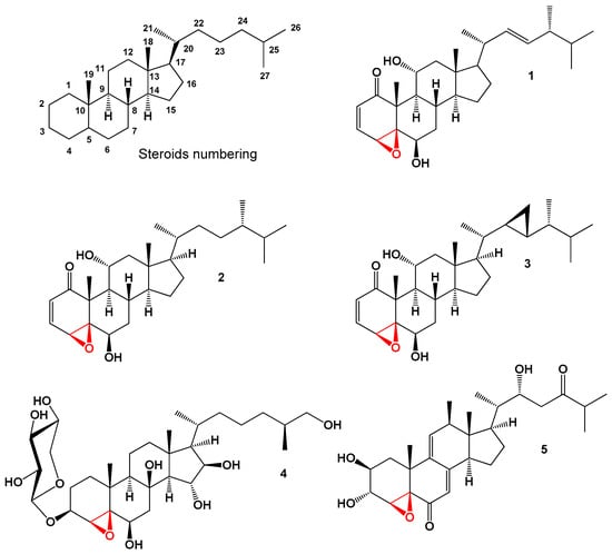 - Vil, V.A.; Gloriozova, T.A.; Poroikov, V.V.; Terent’ev, A.O.; Savidov, N.; Dembitsky, V.M. Peroxy steroids derived from plant and fungi and their biological activities. Appl. Microbiol. Biotechnol. 2018, 102, 7657–7667. [Google Scholar] [CrossRef]