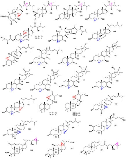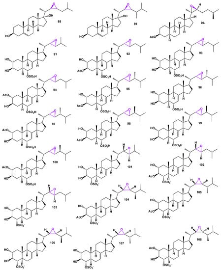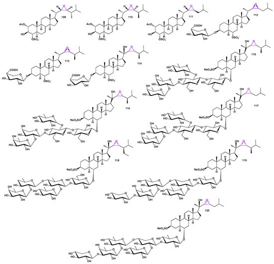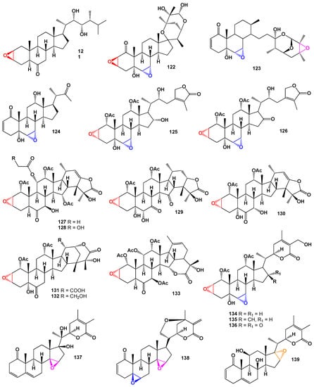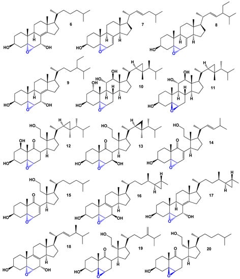 Structures of 5,6-epoxy steroids (6–20) derived from marine sources. Blue is 5,6-epoxy group.