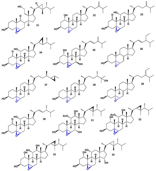 Steroids bearing a 5,6-epoxy group (21–34). Blue is 5,6-epoxy group.