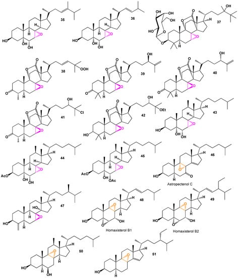 Steroids bearing 7,8- and 8,9-epoxy groups have been discovered in various marine organisms. These include the gorgonian Acabaria undulata (43–45) (a), the starfish Astropecten polyacanthus (46) (b), the sponge Theonella swinhoei (47) (c), and the soft coral Pseudopterogorgia elisabethae (50) (d).