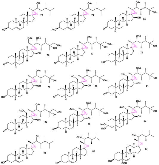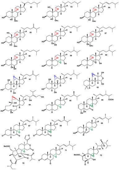 Steroids containing 8,14-epoxy groups (52–60), 9,11-epoxy groups (61–64), and 11,12-epoxy groups (65–72, structures are shown in Figure 14, and activity is shown in Table 5) are naturally found in small amounts in various sources. The distribution of these steroids spans fungi, plants, and marine invertebrates, showcasing their wide occurrence in the natural world. For instance, a polyoxygenated steroid with a 9,11-epoxy group (52) was isolated from the crude extract of the marine sponge Dysidea sp. Collected in Australia. This compound exhibited inhibitory activity against the binding of [I125] interleukin-8 [IL-8] to the human recombinant IL-8 receptor type A [].