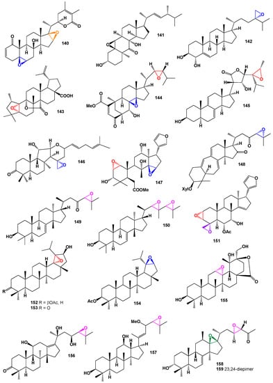 Steroids bearing 8,14-, 9,11- and 11,12-epoxy groups. Red indicates 8,14-, Blue indicates 9,11- and black indicates 11,12-epoxy groups.