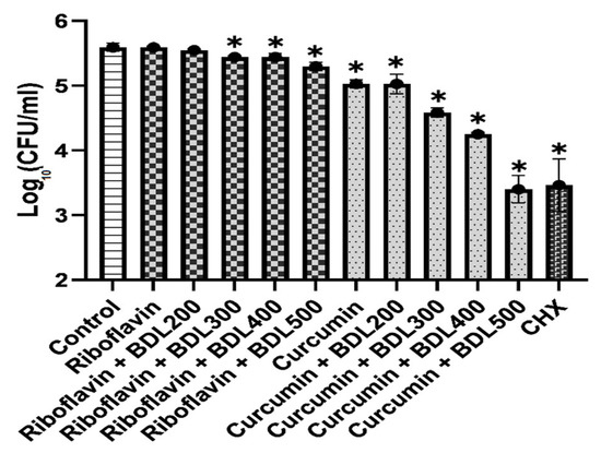 Log10 CFU/mL of Streptococcus mutans of the study groups. * Significantly different compared to control group. BDL: blue diode laser; CHX: chlorhexidine.