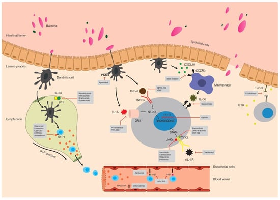 IL-23, a member of the IL-12 cytokine family, is composed of p40 and p19 subunits, with p19 being unique to IL-23. IL-23 plays a crucial role in regulating and amplifying T helper 17 cells and activating various innate immune cells, which are important in the development of chronic inflammatory disorders such as UC and CD [59,60,61,62]. Risankizumab, a monoclonal antibody designed to attach to IL-23 to block its activity, is the first FDA-approved selective IL-23p19 used to treat moderate-to-severe CD patients [63,64,65].
