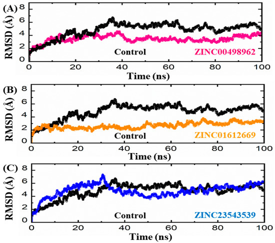 3.3.1. Root Mean Square Deviation (RMSD) Analyses