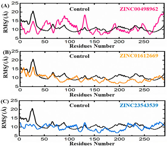 3.3.2. Root Mean Square Fluctuation Analyses