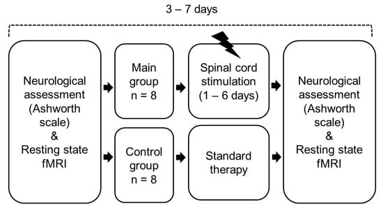 Patients of the main group received a test epidural antispastic stimulation system at the C3–C5 level for a period of 1 to 6 days. The group underwent two resting-state fMRI scans: (1) baseline assessment, which was performed the day before or on the day of the start of SCS therapy, and (2) post-treatment, which was performed on the last day of the SCS therapy or the day after. Patients in the control group had standard therapy and underwent two resting-state fMRI scans with the same time interval as in the main group. The flowchart of patient selection is presented in Figure 2.