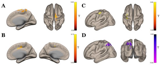Seed-to-voxel analysis, t-statistics for changes (post-SCS vs. pre-SCS) in functional connectivity in the main group with the seed in the (A) brainstem, (B) right precentral gyrus, (C) right supplementary motor area, and (D) left postcentral gyrus (p < 0.05, FDR-corrected); color bars represent positive t-values in orange and negative t-values in blue.