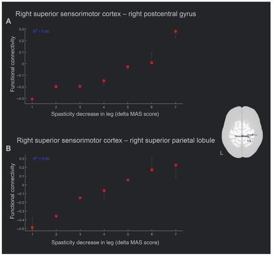 There was a positive correlation between the spasticity decrease in the leg (the higher the delta MAS score, the stronger the mitigation of spasticity) and the functional connectivity increase in two pairs of regions: (1) right superior sensorimotor cortex (0, −31, 67)–right postcentral gyrus (R2 = 0.95, β = −0.68, two-sided p = 0.0011; Figure 4), and (2) right superior sensorimotor cortex (0, −31, 67)–right superior parietal lobule (R2 = 0.86, β = −0.89, two-sided p = 0.008; Figure 6).