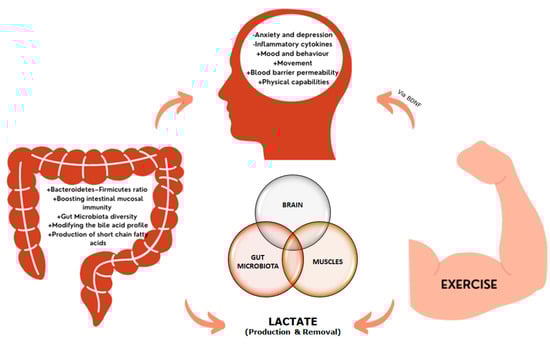 From a molecular point of view, it is necessary to highlight that La− metabolism is at the convergence between exercise, microbiota, and neurobiology. We have already discussed the influence of exercise-induced stress on microbiota status via higher La− levels and increased MCTs content, as well as the enrichment of La−-utilizing bacterial species in the gut and the subsequent higher production of SCFAs to mediate exercise adaptations. However, abnormal elevated and sustained La− concentrations have been linked to the progression of major cellular pathologies that are associated with neurodegenerative diseases []. While physical exercise enhances the flux of SCFAs and La− through an increased expression of MCTs, in the progression of neuropathological diseases, the tissues are not able to participate in the sequestration and utilization of La−, resulting in an allostatic overload []. A recent meta-analysis on post-mortem and in vivo imaging data concluded that increased La− levels and reduced pH are common features of the schizophrenic brain []. In addition, there is a marked association between La− concentrations, hyperphosphorylation of Tau (τ) proteins, and cognitive decline in Alzheimer’s disease []. In general, La− is a stress-related signaling molecule, and the La− production/removal ratio can be positively modified by physical exercise (i.e., higher MCT expression, changes in lactate threshold, and metabolic shifting) []. Thus, it is plausible to state that exercise and microbiota regulate the systemic and brain levels of La− through a feedforward positive motif that might result in energy optimization and control of oxidative stress and hydrogen ion (H+) concentrations. These key features are the core for controlling inflammation and possibly contribute to the preventive and treatment of neurological disorders. This relationship between exercise, gut microbiota health, and cognitive function (gut–brain–muscle axis) is shown in Figure 2.