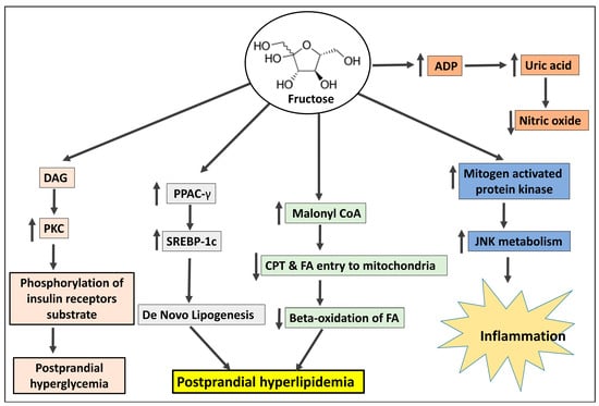 When fructose enters hepatocytes, fructokinase quickly phosphorylates it into fructose-1-phosphate. As part of this process, ATP contributes phosphate, creating ADP, which is then converted into uric acid [50]. A fructose-mediated rise in AMP deaminase facilitates this process [51]. Elevated uric acid levels may cause oxidative stress in hepatocyte mitochondria, enhancing the generation of ROS and eventually leading to mitochondrial dysfunction [52]. Uric acid stimulates hepatic gluconeogenesis through the activation of AMPD2 and AMPK blockade [53]. Uric acid accumulation leads to insulin resistance [53,54], decreased FFA oxidation, endoplasmic reticulum stress, and decreased NO generation, leading to elevated blood pressure [55]. The involvement of fructose in the pathogenesis of IR is depicted in Figure 1.