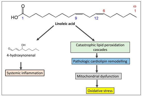 Vegetable oils like canola, sunflower, corn, soy, and safflower oils are rich sources of omega-6 fatty acids, especially linoleic acid [56,57]. Since 1900, vegetable oils derived from seeds and flowers have been extensively used to replace saturated fats such as butter, tallow, and lard. The use of these oils gives processed food more stability. Linoleic acid, the primary omega-6 polyunsaturated fat found in vegetable oils like seed oils [57], increased by more than a factor of two as a result, and it currently accounts for 8% to 10% of the total energy consumed in the West [56]. Conjugated linoleic acid, which is present in pastured animal diets, should not be mistaken for the omega-6 fatty acid linoleic acid. In addition, because linoleic acid has a half-life of approximately two years in adipose tissue, the content of linoleic acid in adipose tissue is a trustworthy indicator of ingestion [58]. Oxidative stress, damage to the tissues, and mitochondrial dysfunction resulting from excess linoleic acid are responsible for various cardiovascular diseases, including Alzheimer’s disease, cancer, dementia, obesity, and diabetes [59]. Excessive consumption of linoleic acid in recent years has led to a reduction in the levels of omega-3 fatty acid intake, with an increasing ratio between omega 6 and omega 3 from 4:1 to 25:1 [60]. Significantly, as alpha-linolenic acid interacts with linoleic acid for conversion to longer-chain polyunsaturated fats, greater ingestion of omega-6 polyunsaturated fat linoleic acid can decrease omega-3 in the body [61]. Since it has long been known that individuals with CAD had lower levels of linoleic acid relative to total fatty acids in lipids, this finding has been used to support the theory that linoleic acid deficiency may be a risk factor for heart disease [62]. However, linoleic acid levels in both adipose tissue and platelets are favorably correlated with coronary artery disease (CAD), but long-chain omega-3 levels in platelets (eicosapentaenoic acid (EPA) and docosahexaenoic acid (DHA)) are negatively correlated with CAD [63]. Linoleic acid produces mitochondrial toxicity and catastrophic cardiolipin modifications [64], which are predisposed to exaggerate oxidative stress and overproduction of reactive oxygen species (ROS). ROS consume natural antioxidants and also produce lipid peroxidation of the cell membrane and DNA damage. Oxidative stress predisposes to IR, obesity, T2DM, heart failure, and cancer. A schematic diagram (Figure 2) shows how linoleic acid may cause inflammation and oxidative stress conditions.