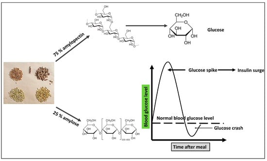 The mechanism by which grains seeds (clockwise from top-left: wheat, spelt, oat, barley) are involved in the pathogenesis of insulin resistance. The branched structure of amylopectin allows more glucose molecules to be hydrolyzed to increase its rate of digestion and increased blood glucose. A straight chain of amylose decreases its digestion rate, so most of it is directed to the large intestine.